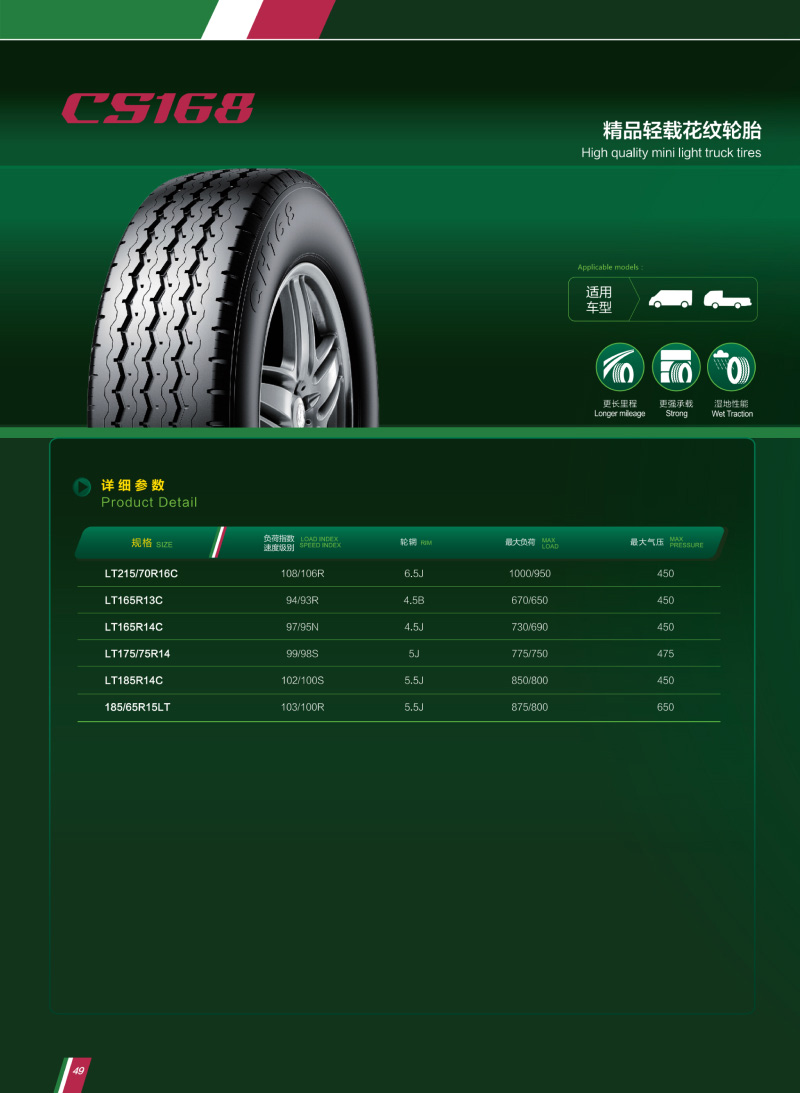 精品輕載花紋曲折的花紋溝槽加雙層胎體結構,更強的承載力,深花紋設計提供卓越的耐久性能。