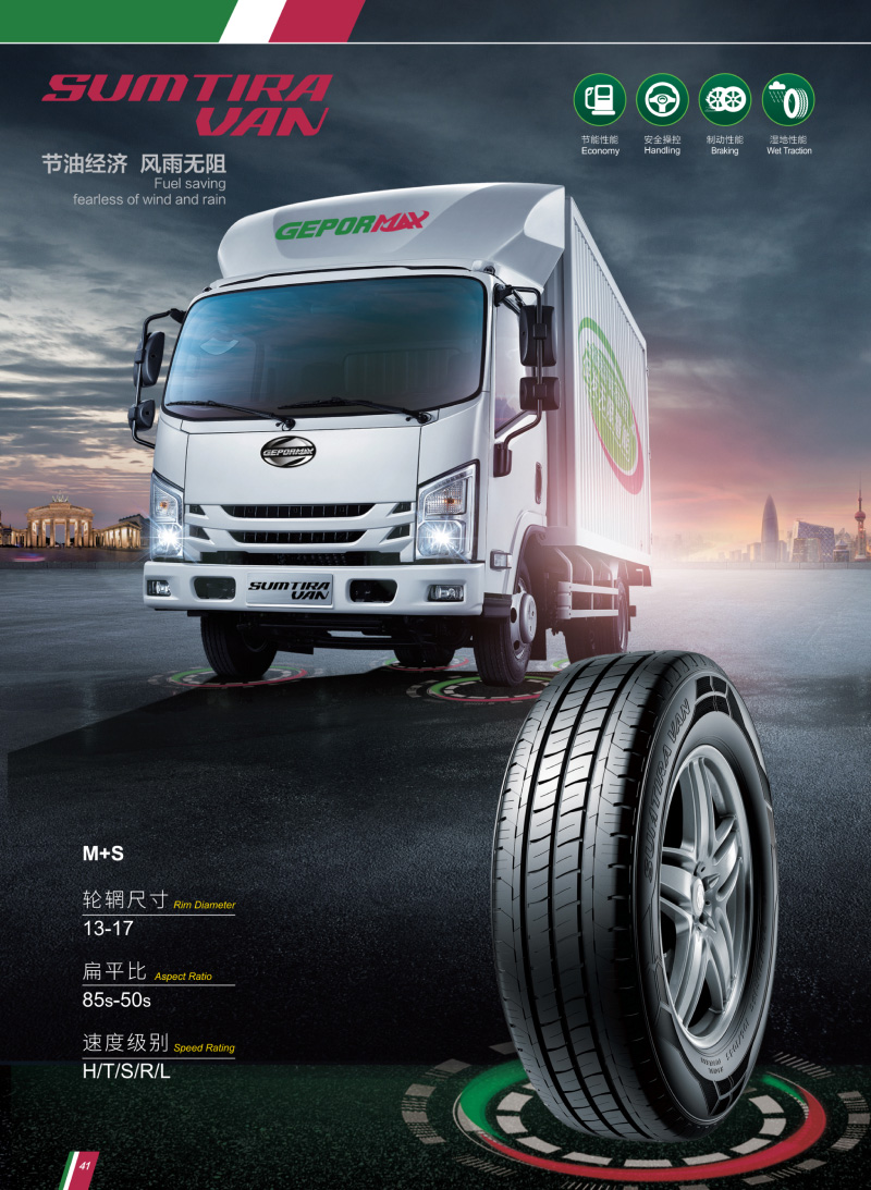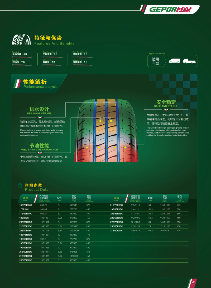 輕型商用車(chē)用輪胎,獨特的花紋溝,深排水槽,有較好的排水性和經(jīng)濟燃油性。
