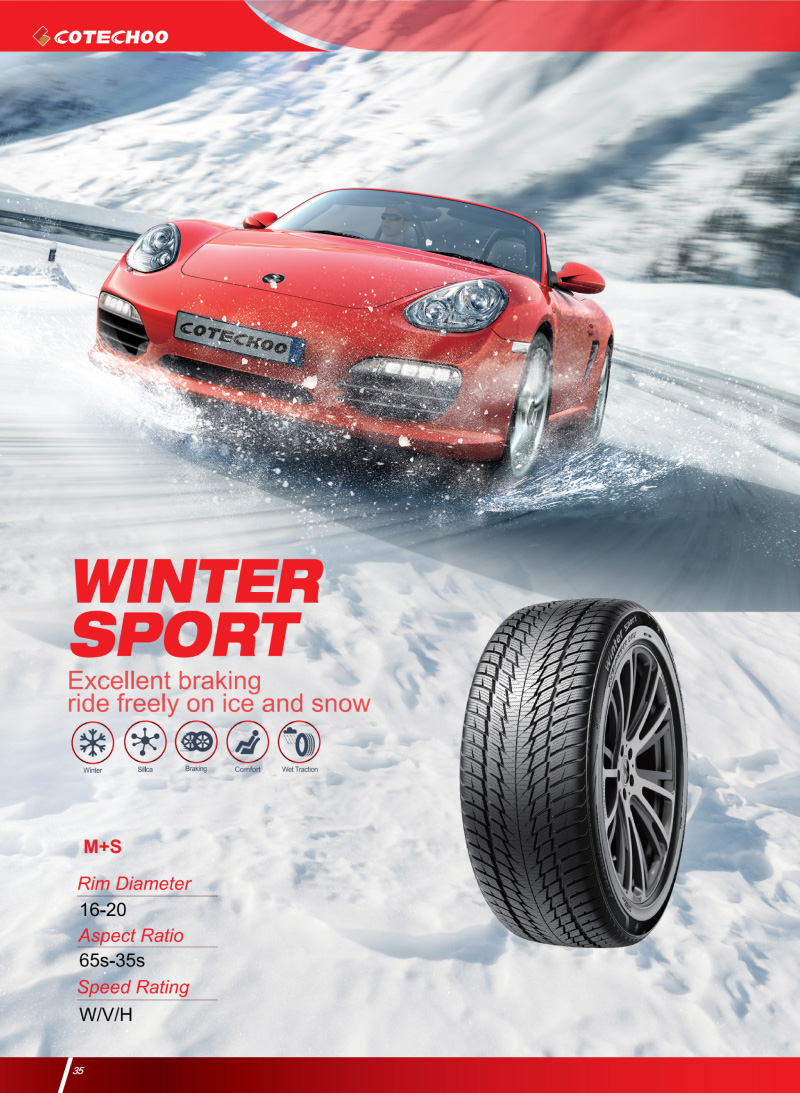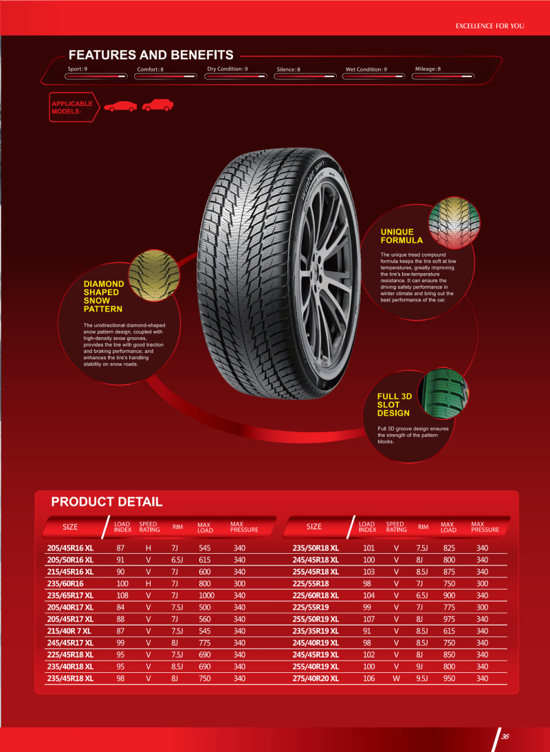 獨特胎面膠料配方及花紋,為輪胎提供良好的牽引力和制動(dòng)性能,可保證在冬季氣候下的駕駛安全性能。
