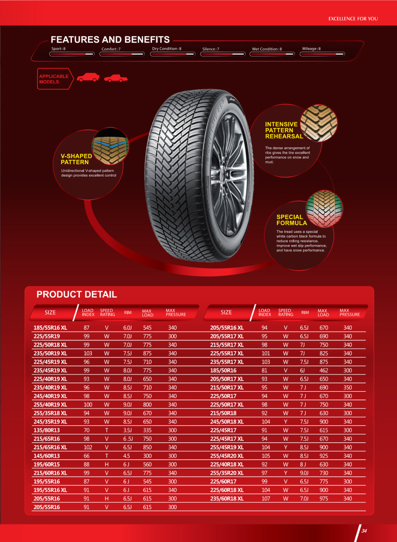 高性能全季節輪胎,全新配方、單導向人字形花紋設計,操控性?xún)?yōu)秀,雪泥地性能優(yōu)越,是一款綜合性極強的四季輪胎。