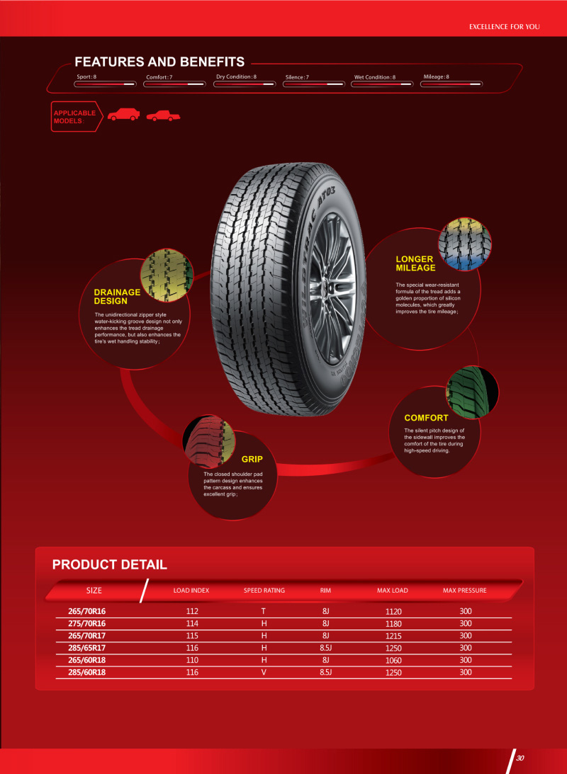 一款優(yōu)秀的全地形輪胎,突破性技術(shù)塑造胎面結構,對各自路況具有良好的適應能力。