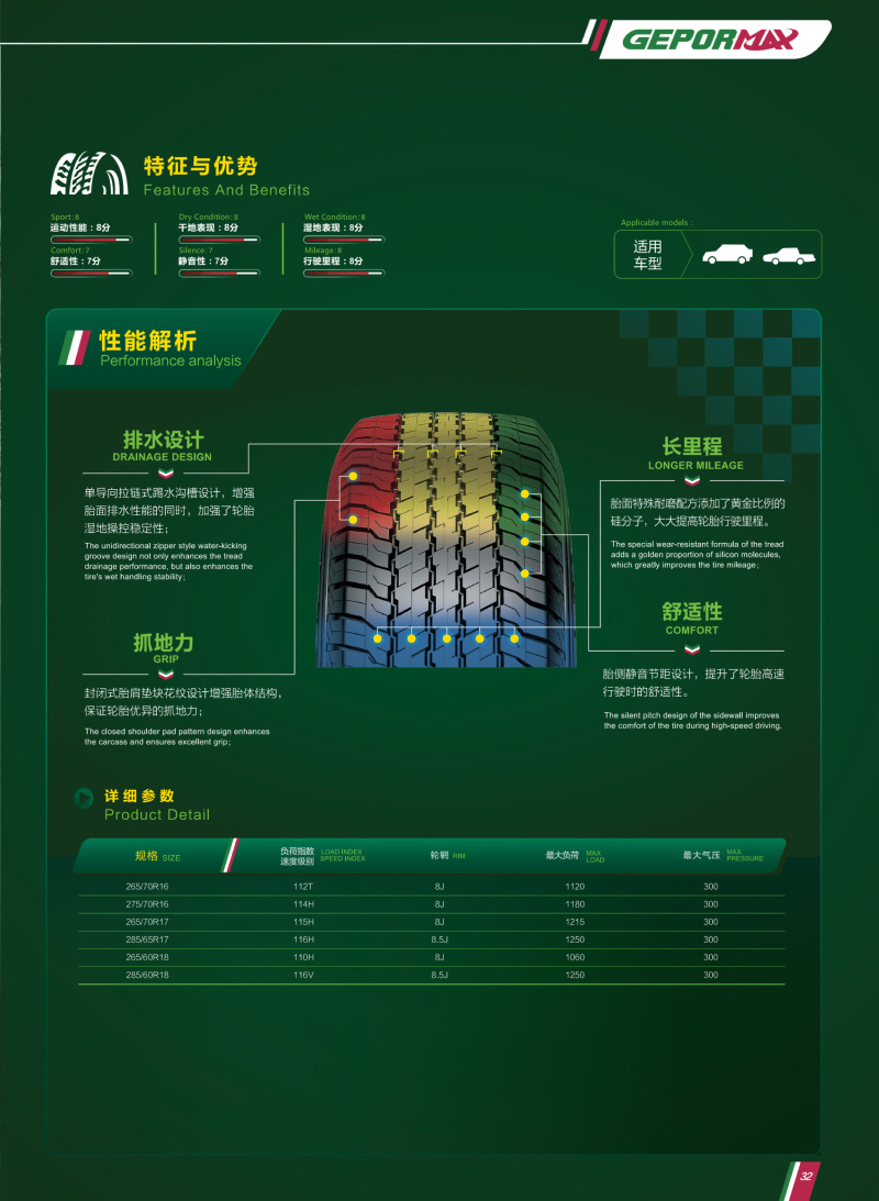 一款優(yōu)秀的全地形輪胎,突破性技術(shù)塑造胎面結構,對各自路況具有良好的適應能力。